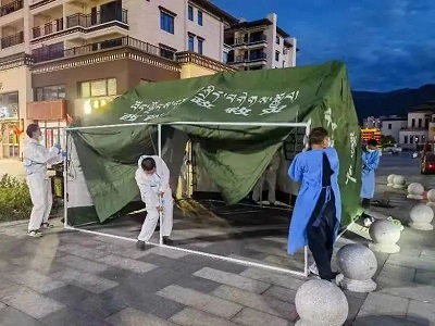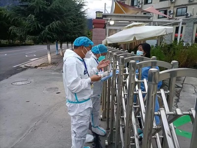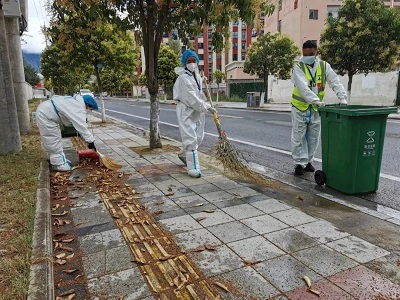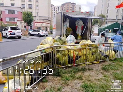 (國策環(huán)保林芝分公司工作人員對(duì)低風(fēng)險(xiǎn)區(qū)域進(jìn)行生活垃圾清運(yùn))